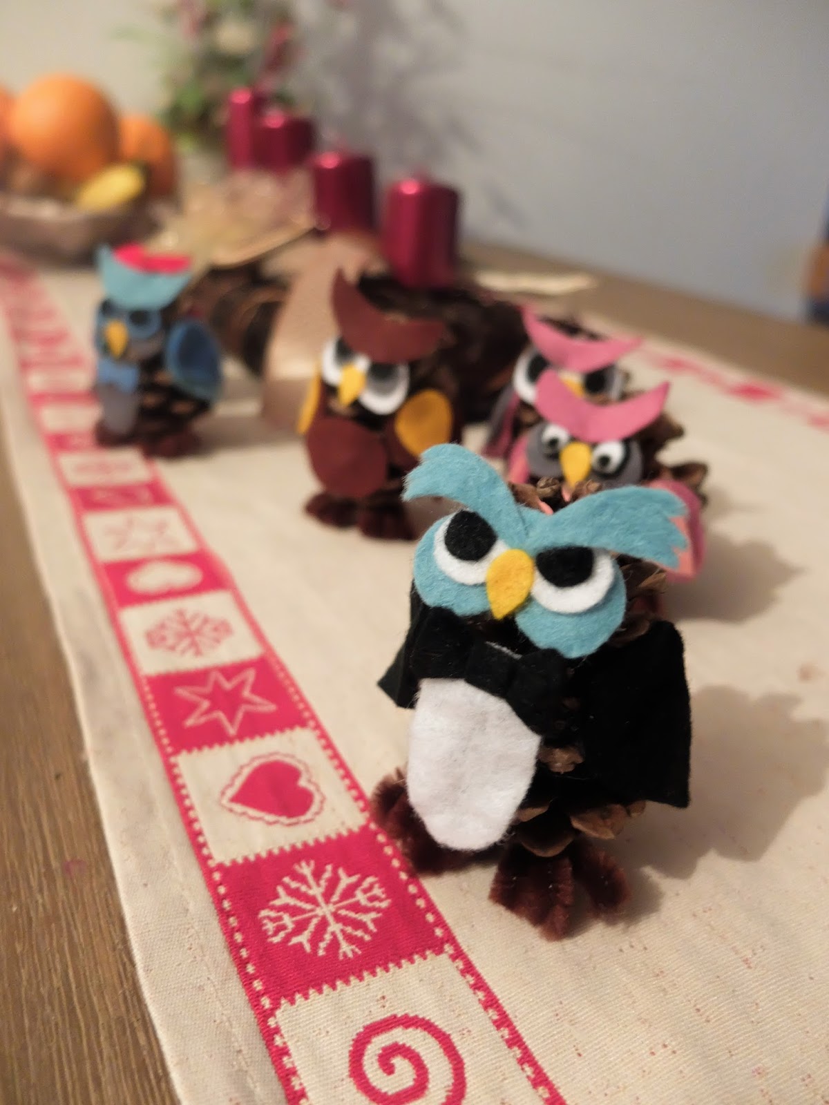 Nejprve je dobré si z papíru připravit papírové šablony na jednotlivé díly. Přece jen vypadá daleko lépe, když jsou díly stejné a práci to ulehčí. Vystřihneme filcové části dle vlastní kreativity a díly k sobě přilepíme lepidlem. Tavnou pistoli použijeme na přilepení dílů přímo k šišce. Na nožičky použijeme tvarovací drátky, které rovněž upevníme použitím tavné pistole. Šišky se mi nejvíce osvědčily borové. Mají krásný tvar a navíc jsou dole zploštělé, čímž pak sovička nepřepadává a krásně stojí. Určitě je důležité nechat šišky dostatečně vysušit. Já jsem byla tak nedočkavá, že jsem sovičky začala vyrábět ještě týž den, kdy jsem šišky nasbírala. Šiška se druhý den cela rozevřela a sovička se tak zdeformovala. Takže jako trénink to nebylo špatné, ovšem druhý pokus se zdařil podstatně lépe. :-)